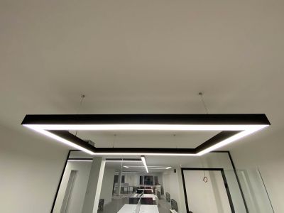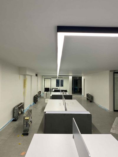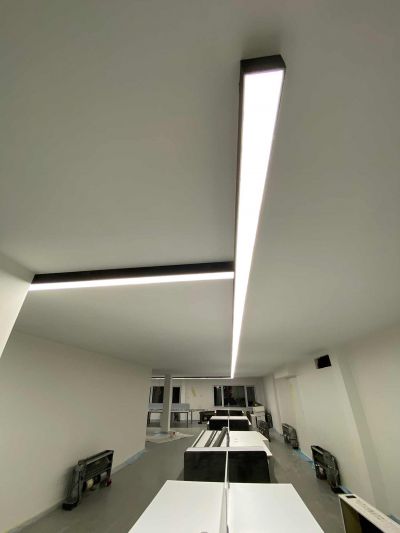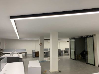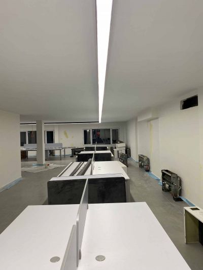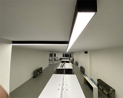 در این پروژه از چراغ های خطی روکار و آویز با بدنه یکسان و به عرض 10 سانتی متر و ارتفاع 8 سانتی متر استفاده شده است. چراغ خطی روکار در فضای آتلیه و بر روی میزهای کار به طول 30 متر و با زوایای گردش 90 و 130 درجه به صورت پیوسته تولید و اجرا گردید. انجام این کار با توجه به وجود دیفیوزر یکپارچه و بدون قطع در طول مسیر در نوع خود منحصر به فرد می باشد.