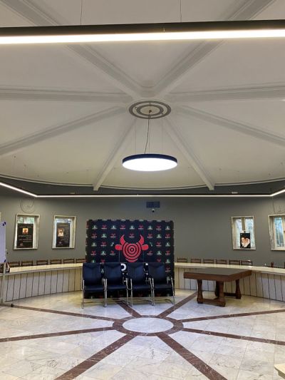 در طراحی نورپردازی سالن کنفرانس بنا به درخواست کارفرما از چراغ های خطی با کد LA-01 به صورت مربعی و چراغ PILLMOON با کد DA-01 با قطر 120 سانتی متر استفاده شده است.همانطور که در تصویر مشاهده میگردد هدف از طراحی نورپردازی ایجاد پارادوکس المان در معماری داخلی می باشد، از این جهت چراغ خطی به صورت مربع محاط در دایره پلان قرار گرفته و در مرکز دایره چراغ PILLMOON جهت روشنایی تجهیزات کارخانه استفاده شده است