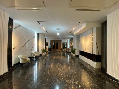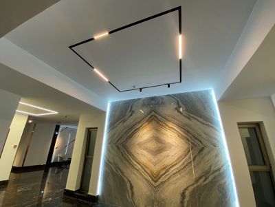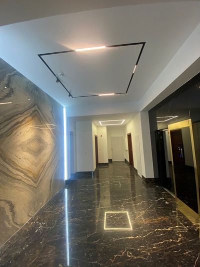 در قسمت ورودی آسانسورها و قسمت انتظار با ایجاد شار نوری بالاتر نسبت به بقیه فضاها بوسیله چراغ خطی توکار مستطیلی با 500lux طراحی و اجرا شده است.