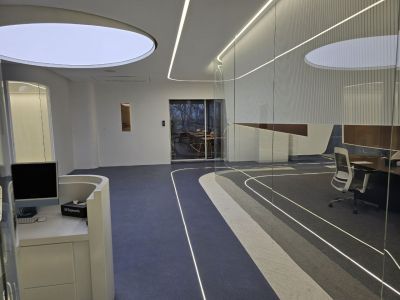 طراحی داخلی این واحد اداری بر اساس فرم کرو و منحنی ایجاد شده است، مهمترین هدف معمار تلفیق فضا، متریال و مبلمان با سیستم نورپردازی منحنی و دایروی میباشد.