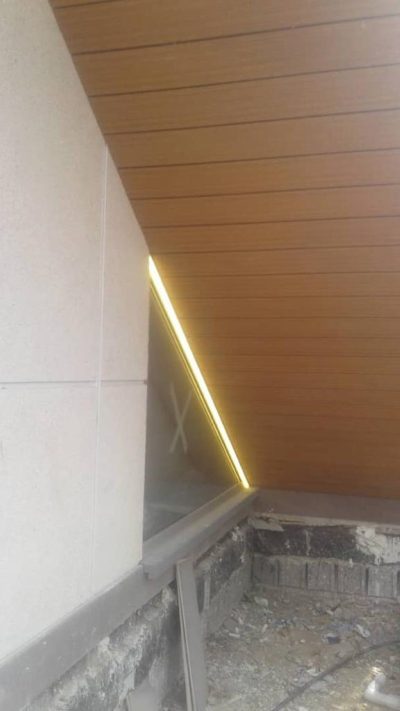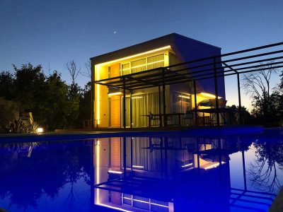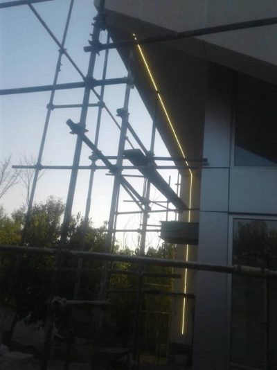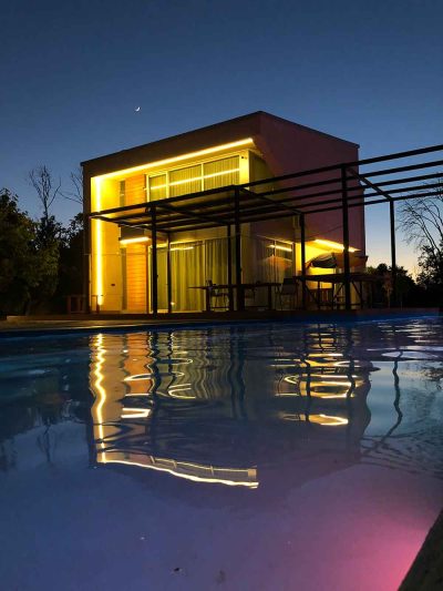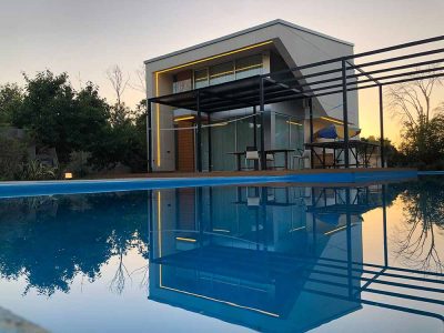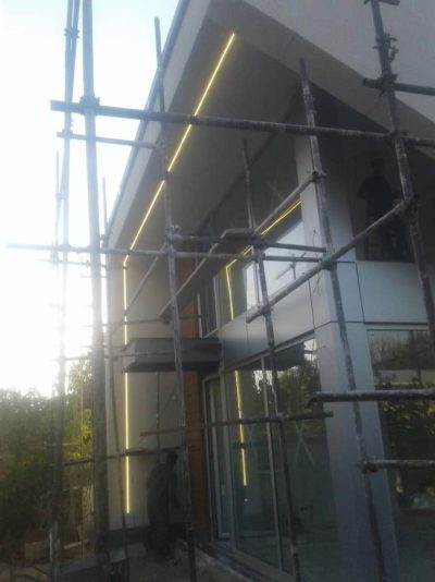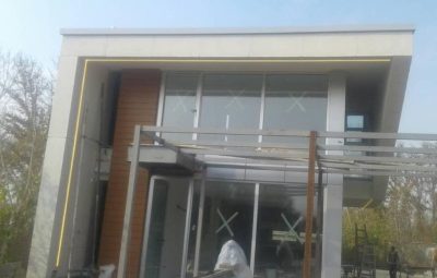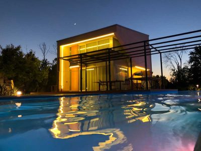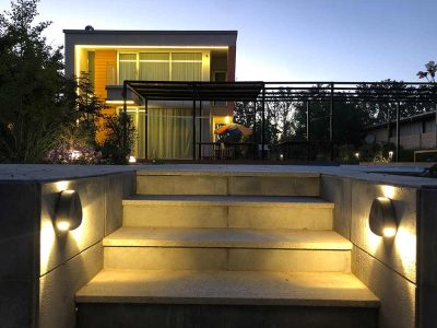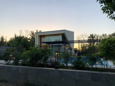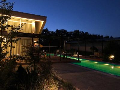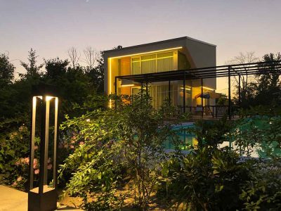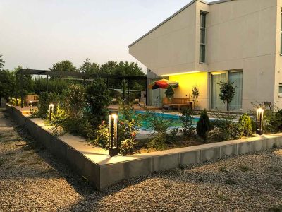 نورپردازی نمای ویلا با استفاده از نورپردازی خطی جهت تأکید بر حجم و معماری منظر در شب در نظر گرفته شده است.