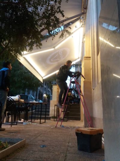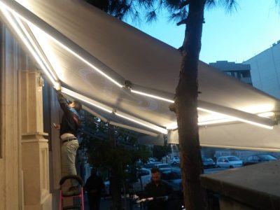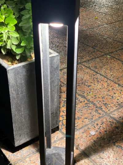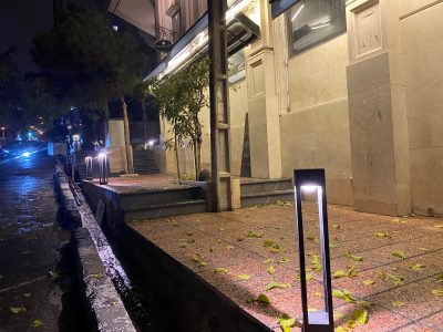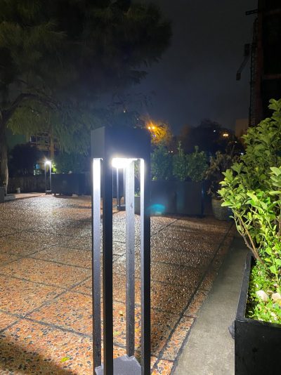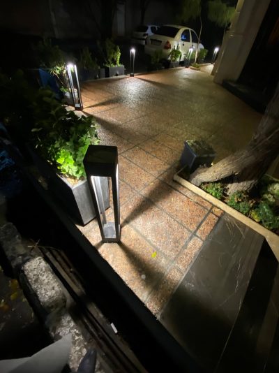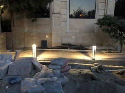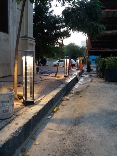 طرح اجرا شده در محوطه پیاده روی اطراف رستوران با استفاده از چراغ های مدرن، مدل رویال با ظاهر مینیمال زیبا انجام شده است و امکان نورپردازی چهار طرفه به صورت نورهای V شکل جهت روشنایی پیاده رو، بر زیبایی آن افزوده است. نورپردازی آلاچیق ها با استفاده از نورهای خطی در بازوهای آلاچیق انجام شده که می تواند هماهنگی کامل جهت باز و بسته کردن آلاچیق را فراهم نماید.