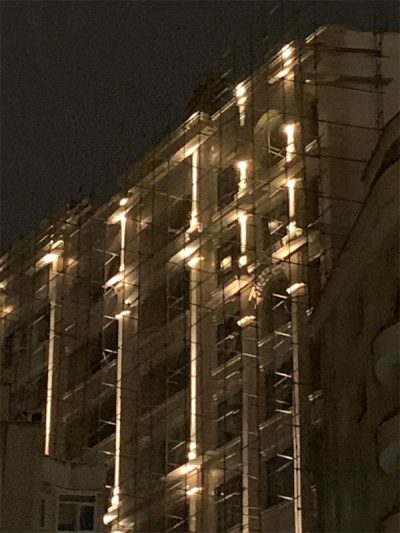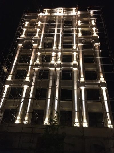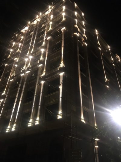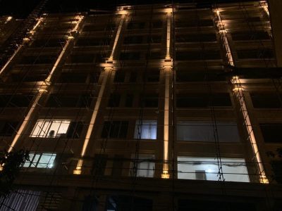 در این پروژه، طراحی بر پایهی ایجاد «کنتراست کنترلشده» انجام شد: ستونها و سرستونها با نورهای روشنتر برجسته شدند و در کنار آن، سایهروشنهای دقیق برای نمایش حجم و عمق نما به کار رفت تا نورپردازی نما جلوهای طبیعی، لوکس و کاملاً معماریمحور پیدا کند. برای اجرای نور، از جتلایتهای ۱۰ وات با چیپ Cree، زاویه تابش ۱۵ درجه و قدرت پرتاب حدود ۱۲ متر استفاده شد. در بخشهایی که ارتفاع ستونها بیشتر بود و احتمال افت شدت نور در مسیر وجود داشت، از ترکیب نور دوبل استفاده شد تا روشنایی در کل ارتفاع ستون یکنواخت و یکدست باقی بماند.