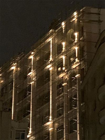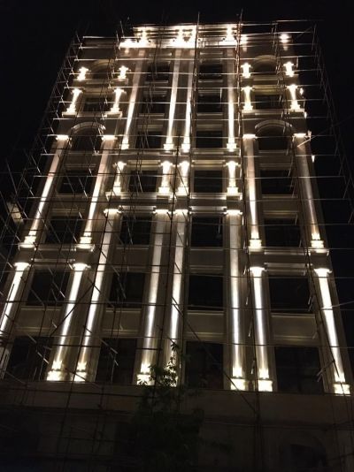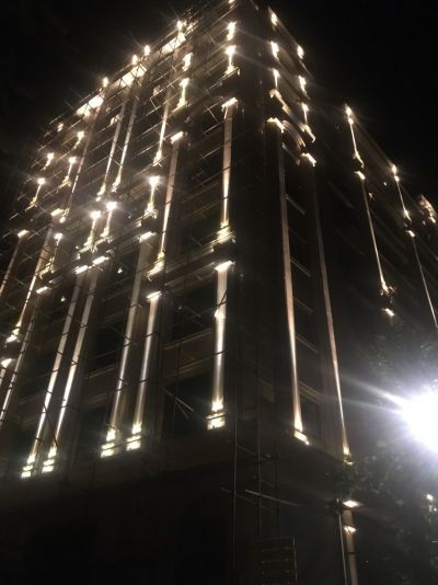 نورپردازی نما با استفاده از جت لایت 10 وات از برند Cree با قدرت پرتاب 12 متر و زاویه 15 درجه استفاده شده و در قسمت هایی که لاین ستون ها بلندتر می باشد جهت جلوگیری از افت نور در مسیر از لایت دوبل استفاده شده است.