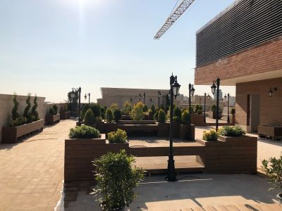 با توجه به مساحت بالای روف گاردن پروژه و طراحی متنوع فضاها در پشت بام و درنظرگرفتن بیشترین زمان استفاده از این محیط در شب، نورپردازی در این فضا از اهمیت بسیار بالا برخوردار بوده، طراحی روشنایی روف گاردن براساس چراغ های ایستاده تک کلاسیک در محیط های ورودی آلاچیق ها و چراغ های دیواری جهت ایجاد شار نوری یکنواخت در محیط بام مورد نظر قرار گرفته است. نحوه چیدمان چراغ براساس محدودیت فضا و یکنواخت بودن نور در پشت بام و عدم وجود فضای تاریک طراحی و اجرا گردیده است.