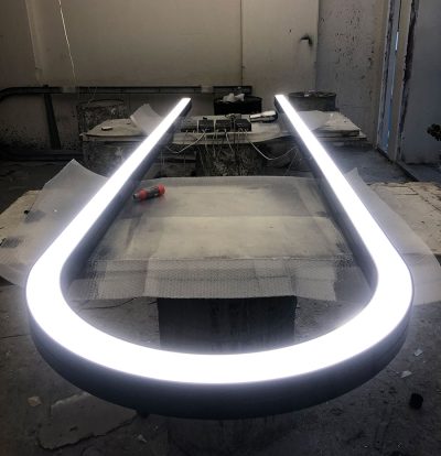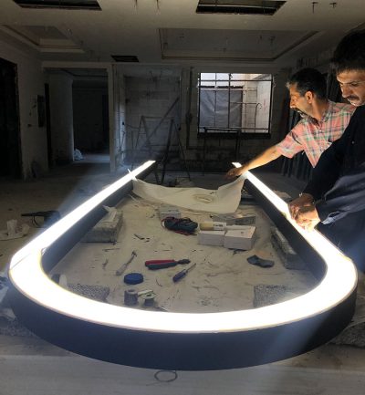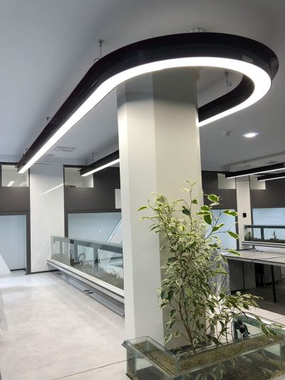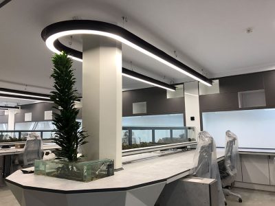 مهم ترین چالش نورپردازی در این پروژه ساخت چراغ های منحنی U شکل جهت روشنایی فضای اداری در طبقات اول تا چهارم و به تعداد 4 عدد در هر طبقه میباشد.