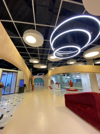 همانطور که در پلان مشاهده مینمایید ایده آرشیتکت پروژه در طراحی نورپردازی شوروم، اجرای چراغ های خطی منحنی با عرض متغییر در طول مسیر و حرکت چراغ بر روی کانترهای نمایش محصول بوده است. در قسمت پذیرش از چراغ pillmoon و در قسمت vip از چراغ رینگی به صورت دوبل استفاده شده است.