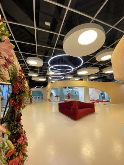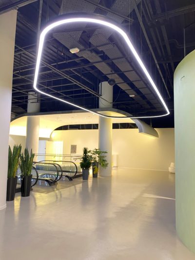 چراغ سفارشی مورد استفاده در این پروژه منطبق بر پلان جانمایی مبلمان اداری طرح و اجرا گردیده است. با توجه به فرم میزها و وجود ستون در این قسمت، طراح جهت یکپارچگی نورپردازی و استفاده از فرم نیم دایره در قسمت کانتر و فلاور باکس ها از چراغ U شکل جهت کاور کردن شار نوری یکنواخت افزون بر زیبایی خیره کننده بهره برده است. وجه امتیاز این مدل چراغ سفارشی در این پروژه شامل نورد یکپارچه قاب چراغ ، سیستم آویز و استفاده از دیفیوزر سراسری و بدون درز در کل مسیر چراغ می باشد.