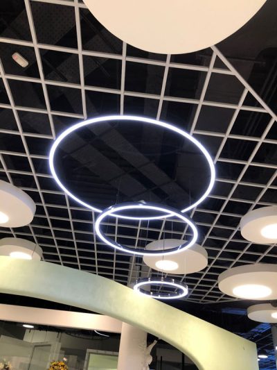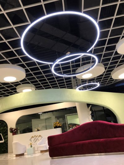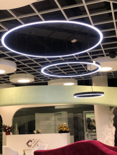 همانطور که در تصاویر مشاهده مینمایید طرح چراغ خطی راهروهای مشاعات مجموعه از محصول چراغ خطی منحنی (LAA) با طرح انعکاسی از فرم کف طراحی و اجرا شده است. در قسمت تقاطع راهروها تلفیقی از چراغ های دایره ای (PILLMOON) به صورت توکار با آرایش نامنظم و ایجاد شار نوری یکنواخت محیطی طراحی، ساخته و اجرا شده است. یکی از خاص ترین و زیباترین محصولات تولید شده در این پروژه لوستر رینگی (DA-03) با قطر های 3 متر، 2 متر و 1 متر به صورت آویز با در نظر گرفتن مراکز دایره جدا میباشد که توانسته زیبایی چشمگیری را در فضای میانی راهروهای مشاعات در دو طبقه این مجموعه ایجاد نماید.