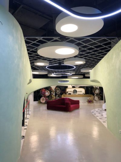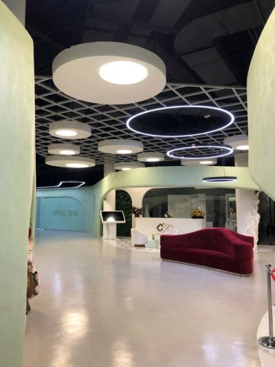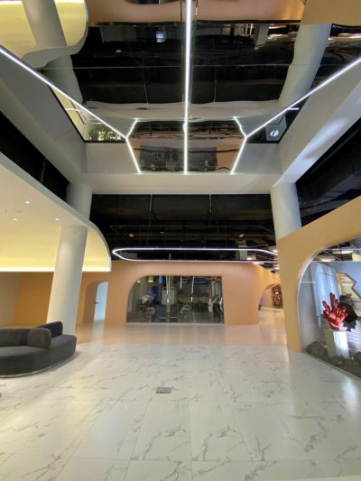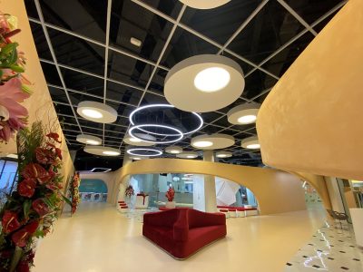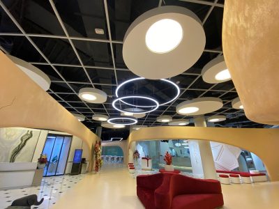 با توجه به طرح و فرم فضای رسپشن ورودی مجموعه در دو طبقه و طرح سقف قارچی معلق این فضا موضوع نورپردازی در جهت نمایش و جلوه سقف مورد توجه قرار گرفت که این مهم توسط محصول WALLWASHER INDOOR این شرمت با لنز 17 درجه و قدرت پرتاب 6 متری در قسمت کناری سقف قارچی انجام و همانطور که در تصویر مشاهده مینمایید نورپردازی سقف توانسته است کانسپت طراحی و فرم در فضا را به خوبی محقق سازد.
