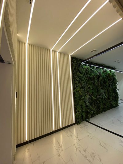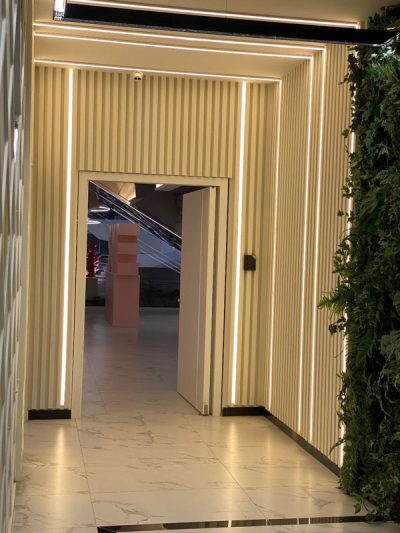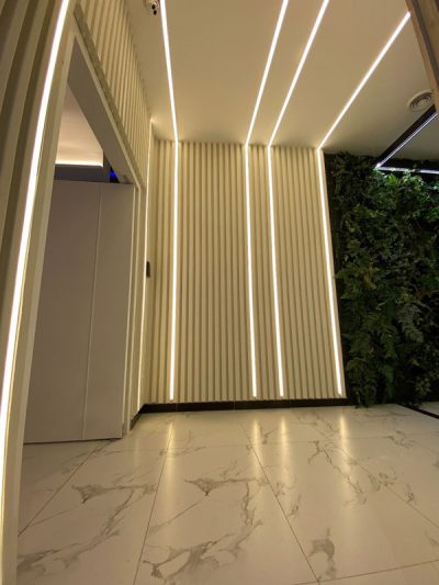 یکی دیگر از فضاهای نورپردازی شده این مجموعه لابی ورودی آسانسورها می باشد که توسط چراغ مستطیلی از تیپ LA-01 به صورت MIRROR سنگ اجرا شده در کف تولید و اجرا گردیده و در سمت دیگر در شیار ایجاد شده در دیوار و سقف از چراغ خطی توکار با کد EA-010 استفاده شده که با توجه یه طرح و فرم اجرا شده در سقف و دیوار زیبایی و شار نوری جذابی را در فضای لابی آسانسورها پدید آورده است.