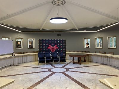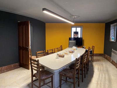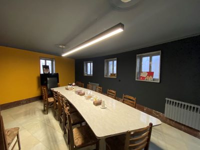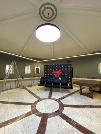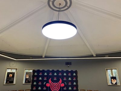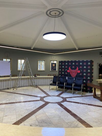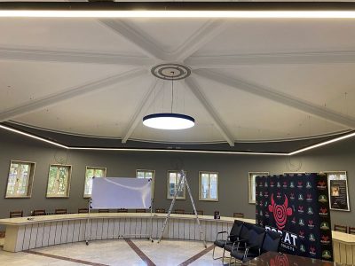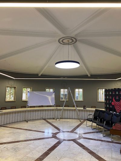 در طراحی نورپردازی سالن کنفرانس بنا به درخواست کارفرما از چراغ های خطی با کد LA-01 به صورت مربعی و چراغ PILLMOON با کد DA-01 با قطر 120 سانتی متر استفاده شده است.همانطور که در تصویر مشاهده میگردد هدف از طراحی نورپردازی ایجاد پارادوکس المان در معماری داخلی می باشد، از این جهت چراغ خطی به صورت مربع محاط در دایره پلان قرار گرفته و در مرکز دایره چراغ PILLMOON جهت روشنایی تجهیزات کارخانه استفاده شده است