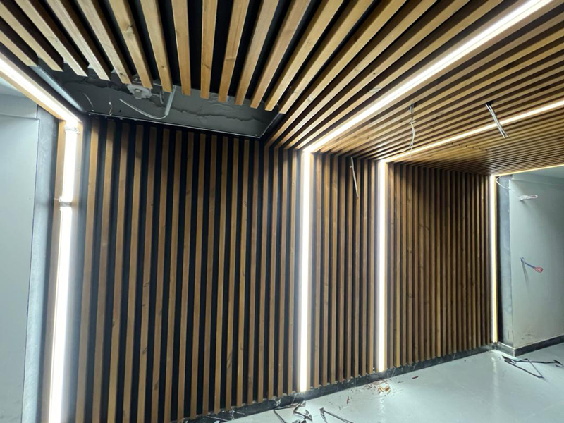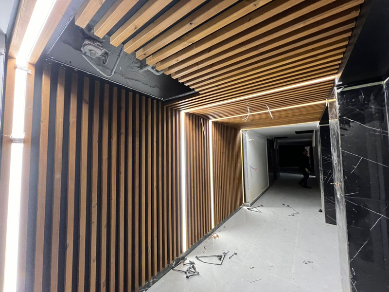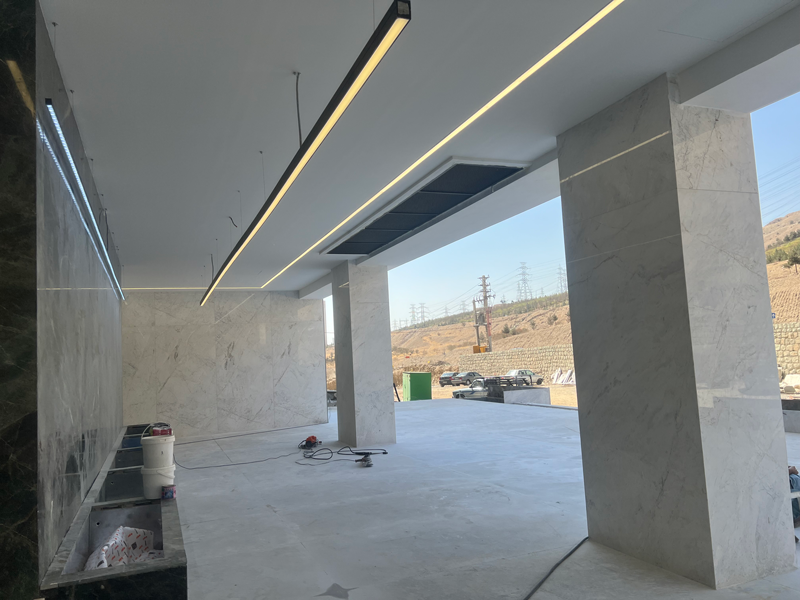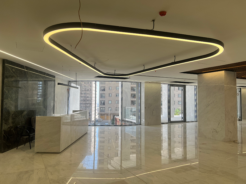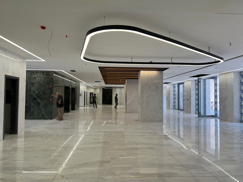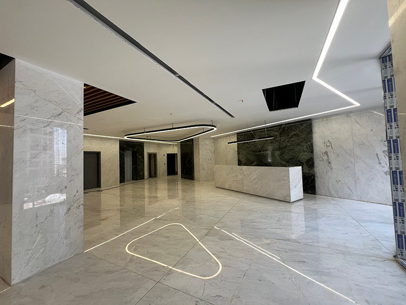 محصولات مورد استفاده شامل چراغ خطی توکار، چراغ خطی روکار و چراغ منحنی آویز مدولار مورد استفاده قرار گرفته است. جهت ایجاد یک شار نوری یکنواخت در پیرامون محیط لابی از چراغ خطی توکار با عرض 6 سانتی متر و توان 60 وات با کلوین 4000 و در فضای بین لوورهای چوبی از چراغ خطی روکار عرض 6 با کلوین 3000 و چراغ های منحنی مدولار آویز با در نظر گرفتن فرم پلان در محل آویز ساخته و نصب شده است.