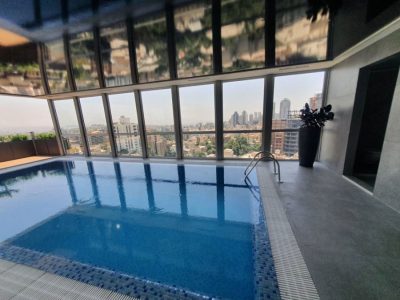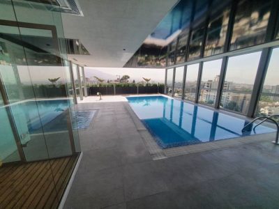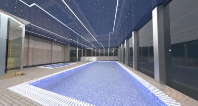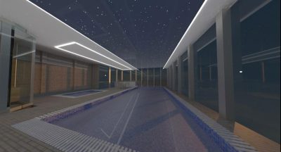 با توجه به موقعیت استخر در بام و نمای شیشه ای سرتاسری فضا و محدودیت ارتفاع سقف، طراحی نورپردازی بر اسا المان های نوری توکار بدون کاهش ارتفاع مورد نظر قرار گرفته است بر این اساس سه آترناتیو طراحی به کارفرمای محترم ارائه گردید.