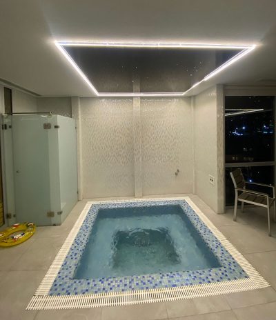 یکی از بهترین گزینه های کاربردی در فضای استخر استفاده از سقف های کشسان (باریسول) بدلیل مقاومت در برابر کلر و رطوبت و همچنین زیبایی و انعکاس فضا میباشد. از این جهت طرح سقف کشسان لاکر مشکی جهت پوشش سقف فضای استخر و جکوزی به همراه نور خطی محاطی وفیبر نوری کهکشانی در این قسمت مورد تایید و اجرا گردید.