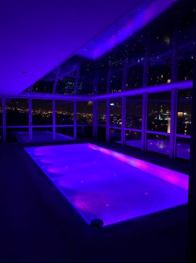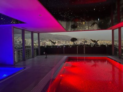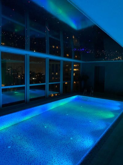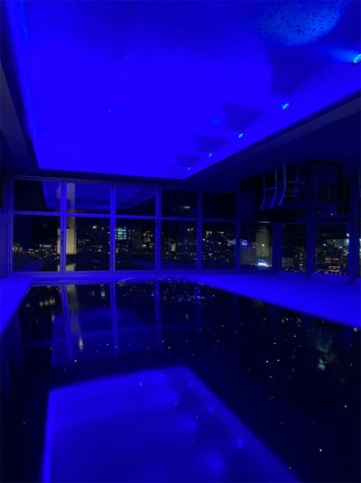 سناریوی بعدی نورپردازی فضای استخر بر اساس نور dark light با استفاده از ترکیب نور داخل آب استخر و نورپردازی فیبر نوری به صورت نامنظم و کهکشانی در سقف کشسان لاکر مشکی میباشد.منبع نوری مورد استفاده در فیبر نوری از نوع RGB-W میباشد که علاوه بر ترکیب نورهای مختلف دارای چیپ نوری مجزای سفید جهت ایجاد حداکثری نور را فراهم مینماید.