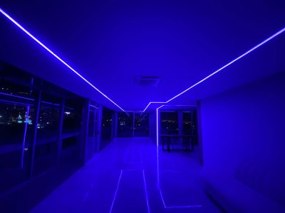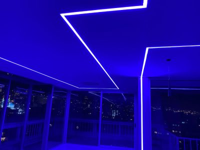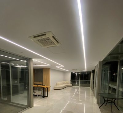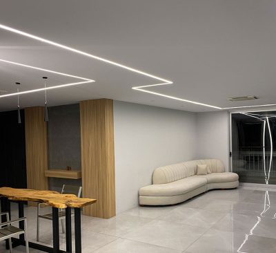 همانطور که در تصاویر مشاهده مینمایید چراغ خطی توکار به عرض 3 سانتی متر طراحی و دو لاین ماژول نوری به صورت یک لاین دینامیکی RGB به همراه ریموت کنترل موزیکال و یک لاین ماژول نوری استاتیکی 20 وات با کلوین رنگ 3000 جهت نورپردازی جنرال محیطی طرح و اجرا گردیده است.
