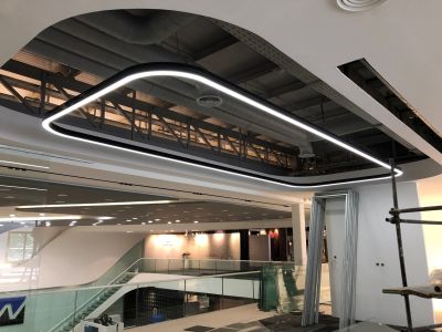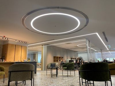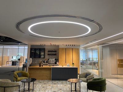 در فضای کناری سالن کنفرانس چراغ خطی دایره ای توکار بدون لبه(frameless) از تیپ محصولات DA-07 جهت هماهنگی با پلان مبلمان طراحی و اجرا شده است.