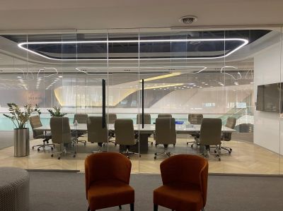 همانطور که در تصویر مشاهده مینمایید سالن کنفرانس در یک اتاق شیشه ای با گوشه های کرو قرار گرفته و میز کنفرانس هم ساختاری مشابه فضای اتاق دارد .طرح معمار پروژه طراحی چراغ خطی منطبق بر پلان مبلمان و فضای کار شده بوده است.از این جهت استفاده از محصول طراحی و ساخته شده اختصاصی در معماری داخلی این فضا مورد توجه میباشد و نتیجه کار تولید چراغ خطی منحصر به فرد مستطیلی با گوشه های منحنی و دیفیوزر سراسری یکپارچه و بدون درز در این فضا گردید.