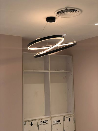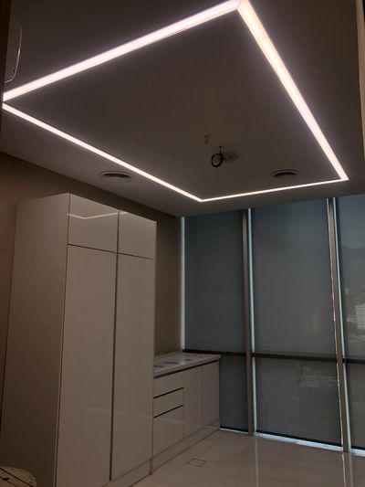 در فضای اتاق ها با توجه به سقف کناف و ارتفاع محدود از چراغ های خطی توکار با عرض 6 سانتی متر و به صورت مستطیلی محاط بر محیط اتاق و بر اساس LUX نوری استاندارد فضای درمانی با کلوین رنگ 4000 طرح و اجرا گردیده است.